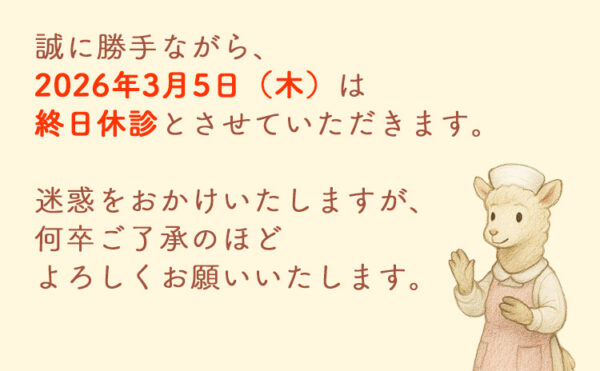 誠に勝手ながら、2026年3月5日(木)は終日休診とさせていただきます。 迷惑をおかけいたしますが、何卒ご承知のほどよろしくお願いいたします。