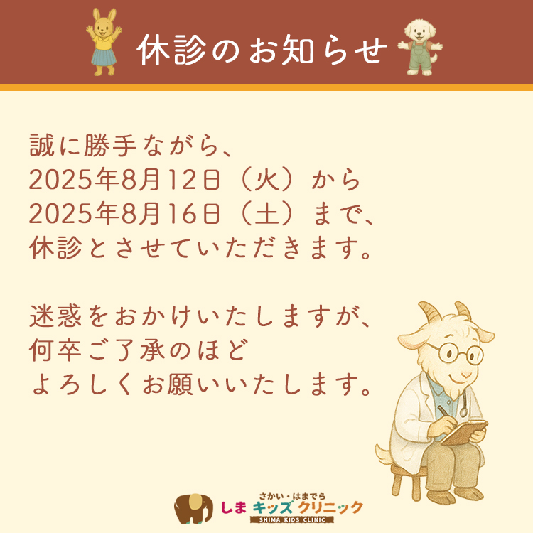 8月12日(火)から8月16日(土)まで休診とさせていただきます。